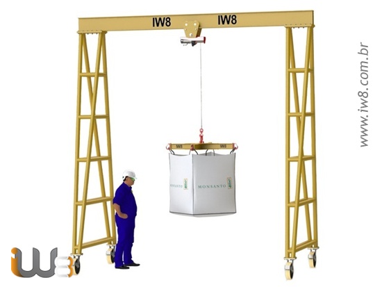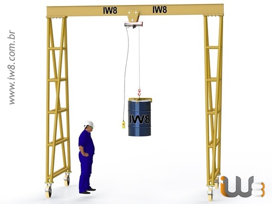 IW8 pode ser projetado conforme as necessidades do cliente e atende Oficinas, Empresas, Depósitos, Fabricas e Indústrias de pequeno, médio e grande porte para movimentação de diversas cargas como Dispositivos para Içamento de Tambores, Caixas e Motores.
